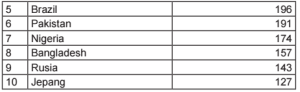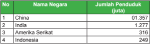 a. Jumlah pendudukBerdasarkan Data kependudukan Dunia, jumlah penduduk Indonesia menempati urutan keempat didunia setelah China, India dan Amerika Serikat. Jumlah penduduk mencapai 249 juta jiwa.
