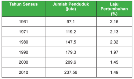 Dari data hasil sensus, diketahui bahwa laju pertumbuhan penduduk Indonesia mengalami perubahan dari waktu ke waktu. Pertumbuhan penduduk di suatu wilayah dikatakan tinggi jika laju pertumbuhan penduduknya mencapai angka lebih dari 2% . Jika angka pertumbuhannya antara 1 dan 2 persen, laju pertumbuhan termasuk sedang. Jika angka pertumbuhan kurang dari satu persen, laju pertumbuhan termasuk rendah.