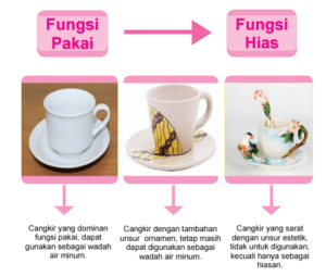 - Sebagai benda dipakai, kerajinan yang dibuat berdasarkan tujuan untuk digunakan sebagai kebutuhan sehari-hari.